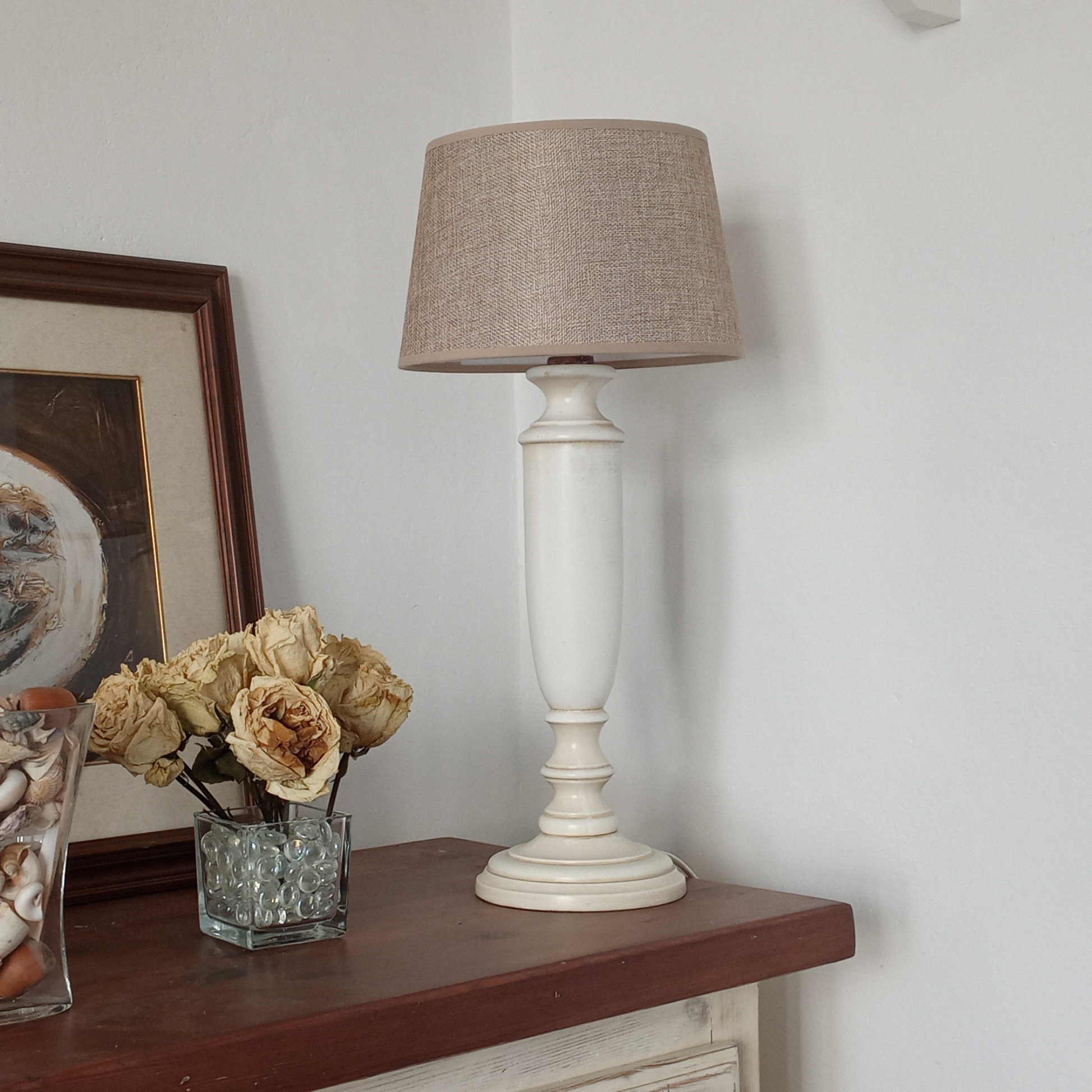 Realizzata in legno verniciato bianco panna con effetto leggermente anticanto, presenta un paralume in tessuto color crema rifinito con un delicato bordo decorativo.